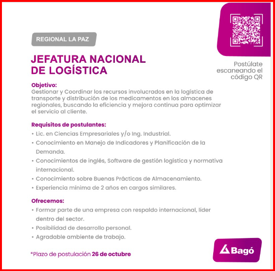 ✅ Postulación a JEFATURA NACIONAL DE LOGÍSTICA en la ciudad de LA PAZ sigue este enlace: https://lnkd.in/evzP5ANt