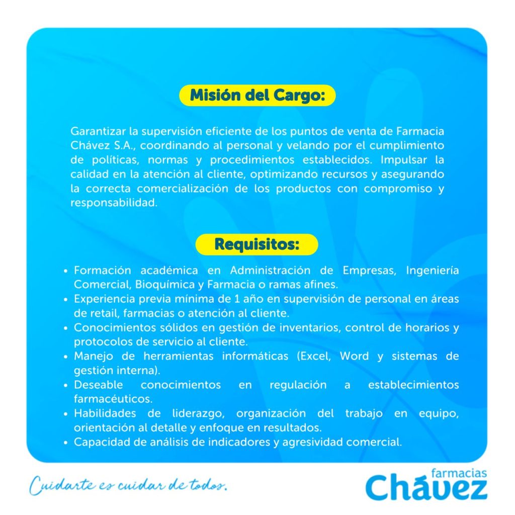 En Farmacias Chávez, con más de 37 años de trayectoria y liderazgo en retail farmacéutico, buscamos un Supervisor Operativo que quiera crecer junto a una empresa certificada como uno de los mejores lugares para trabajar en Bolivia.