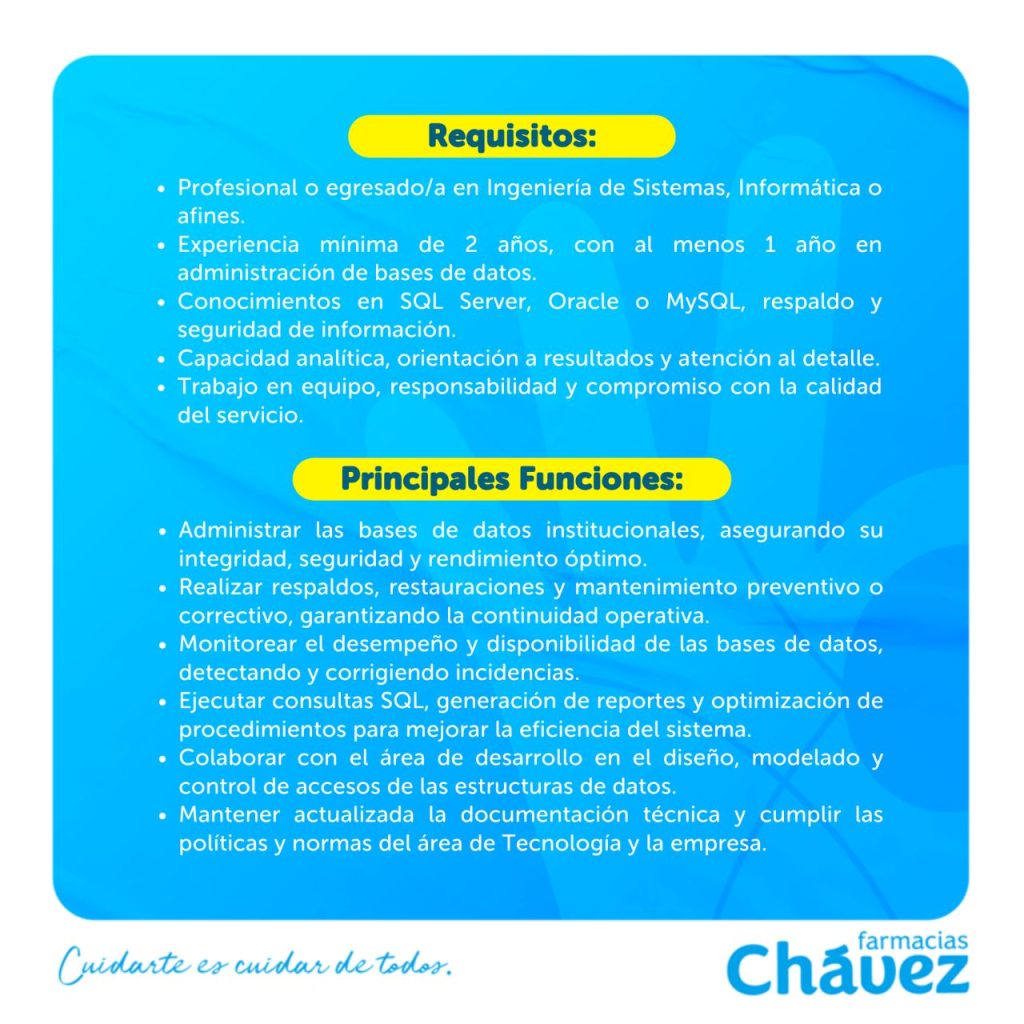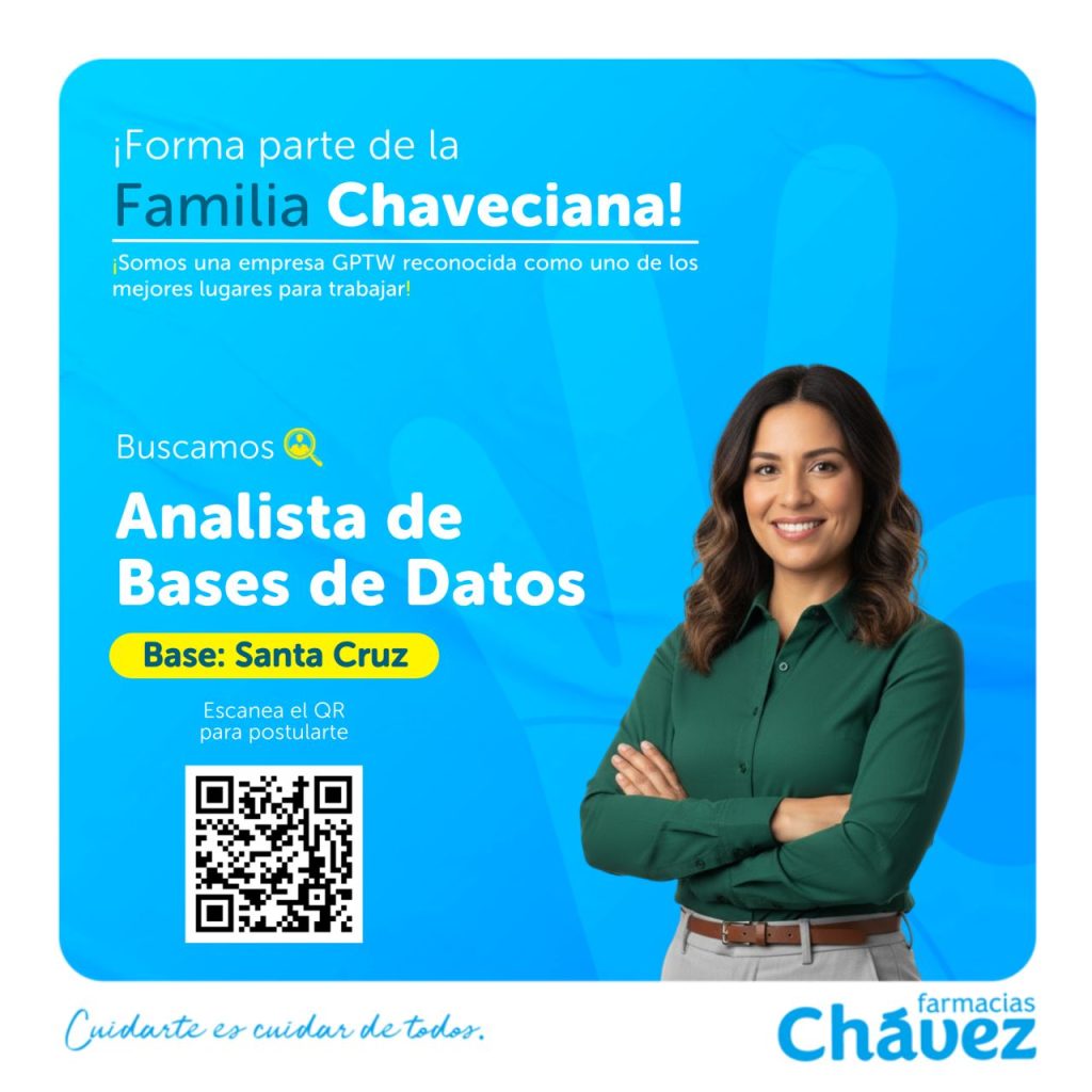 En Farmacias Chávez, con más de 37 años de trayectoria y liderazgo en retail farmacéutico, buscamos un Analista de Base de Datos que quiera crecer junto a una empresa certificada como uno de los mejores lugares para trabajar en Bolivia.