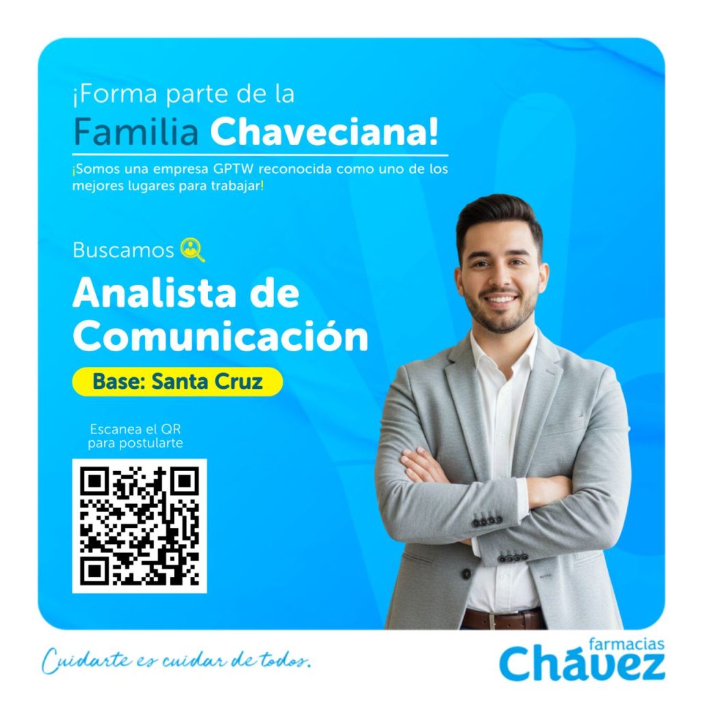 En Farmacias Chávez, con más de 37 años de trayectoria y liderazgo en retail farmacéutico, buscamos un Analista de Comunicación que quiera crecer junto a una empresa certificada como uno de los mejores lugares para trabajar en Bolivia.