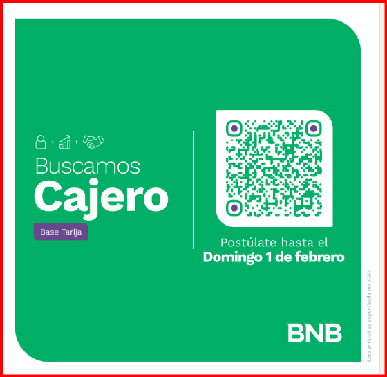 Buscamos personas para nuestra cartera de talento motivadas a aportar desde el área de Cajas en la ciudad de Tarija, brindando una excelente experiencia a nuestros usuarios y clientes en las diferentes agencias. 🏦 💚
