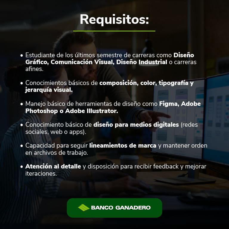 Si estás en los últimos semestres de Diseño Gráfico, Comunicación Visual, Diseño Industrial o carreras afines, manejas lo básico de Figma o herramientas de diseño y quieres aprender trabajando en proyectos digitales reales, nos interesa conocerte.