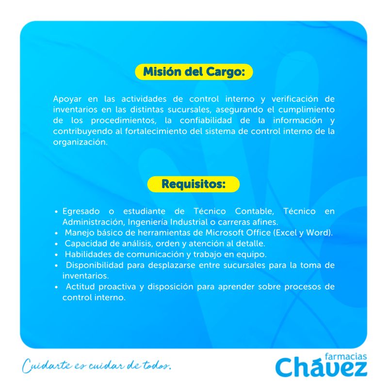 En Farmacias Chávez, con más de 37 años de trayectoria y liderazgo en retail farmacéutico, buscamos un Pasante de Control Interno que quiera crecer junto a una empresa certificada como uno de los mejores lugares para trabajar en Bolivia.