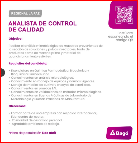 ✅ Postulación a ANALISTA DE CONTROL DE CALIDAD (MICROBIOLOGÍA) sigue este enlace: https://lnkd.in/eSKn6Ymr